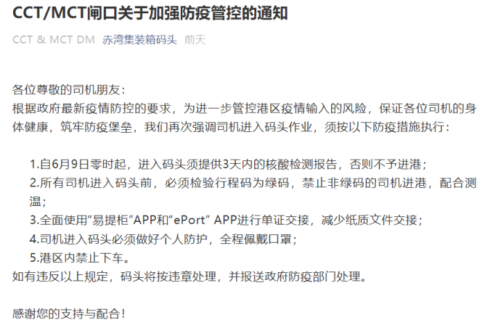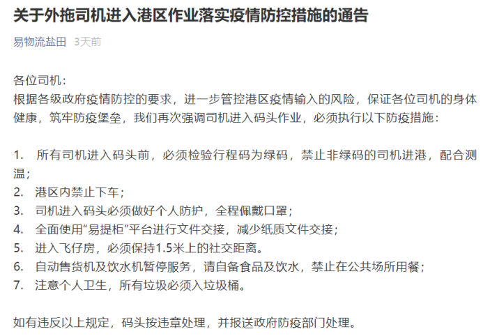 各大码头先后发布关于外拖司机进入港区作业的防控措施通告。
