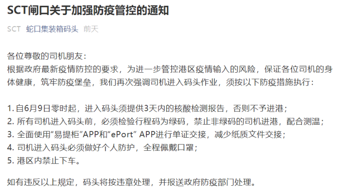 随后,广州港也发布通告称,为进一步管控港区疫情输入风险,保障各位司机的身体健康,进出南沙港区作业的货车司机,需要执行以下防疫措施: