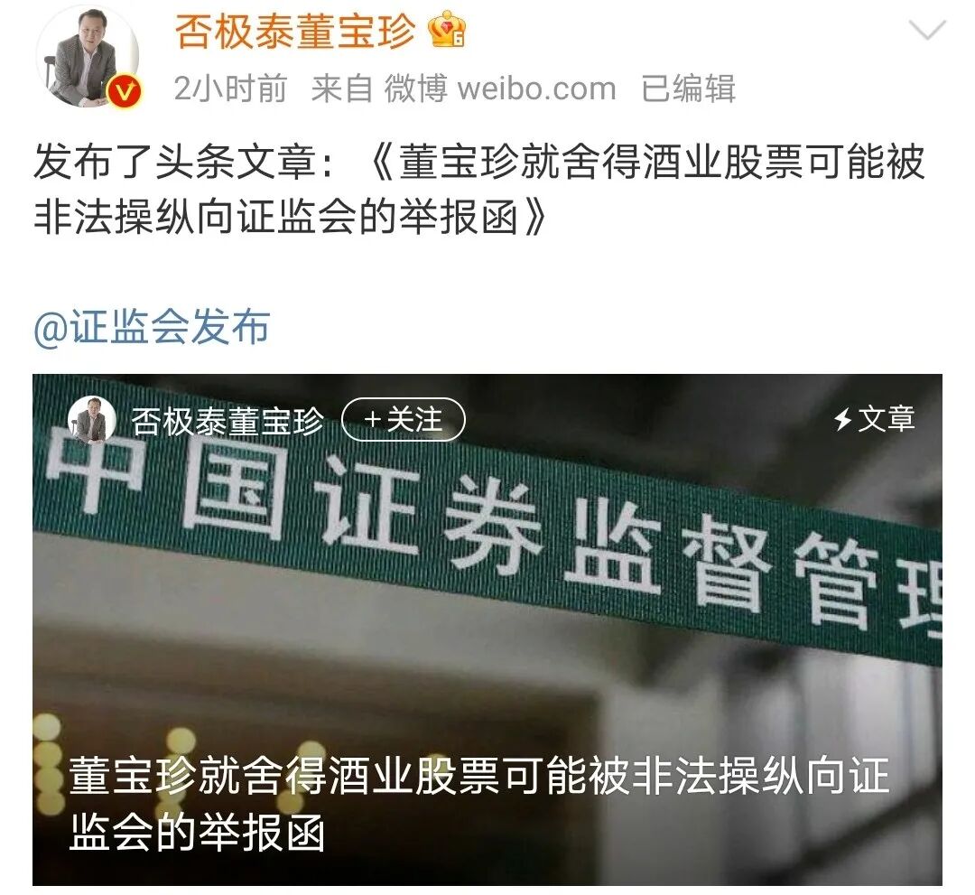 6月9日晚间,知名大V董宝珍发布微博,他对过去一年涨了将近十倍的股票,一季报仍有5.3万投资者的“舍得酒业”进行了举报。他说:“我就舍得酒业股票可能被非法操纵向证监会进行举报。”