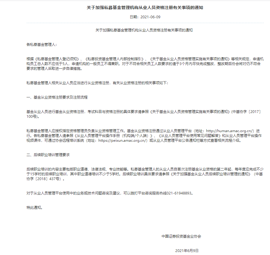 6月9日,中基协通过AMBERS系统发布《关于加强私募基金管理机构从业人员资格注册有关事项的通知》,明确规定申请私募基金管理人登记的机构员工总人数不应低于5人,且一般员工不得兼职。