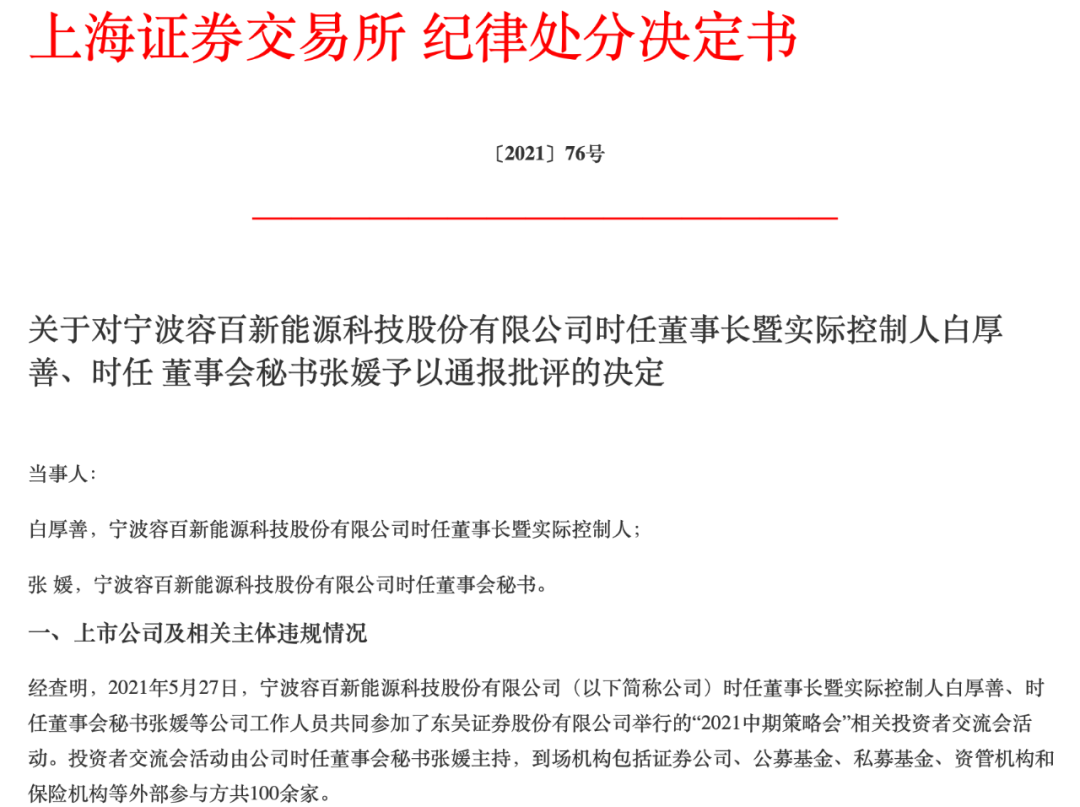 日前,容百科技时任董事长暨实际控制人白厚善、时任董事会秘书张媛等公司工作人员共同参加了东吴证券“2021中期策略会”相关投资者交流会活动,会上透露有关经营生产的重大信息,并做出公司业绩超预期的相关预测,对股价影响明显、传播范围广,这一行为严重违反了信息披露公平性要求,影响恶劣,最终双双遭到了上交所的通报批评。