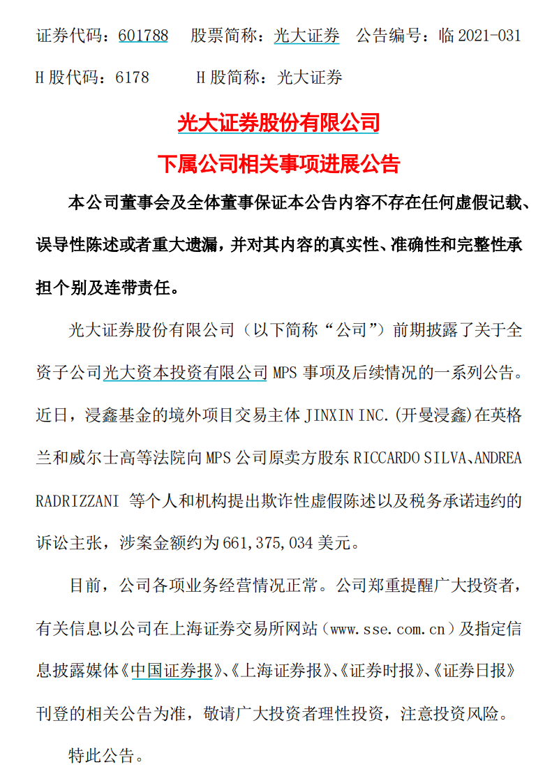 当年轰动海外的一项并购案,光大证券踩雷MPS(MP&Silva Holding S.A.)项目,巨亏了几十亿之后,迎来了新的进展。