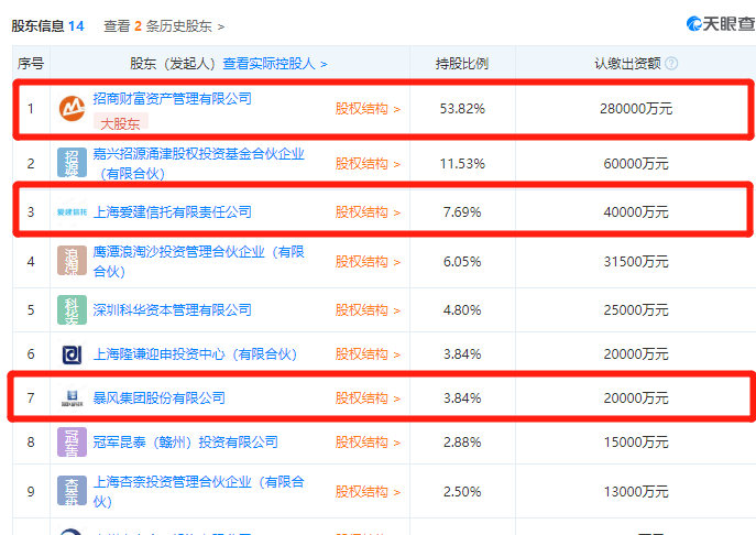 天眼查显示,浸鑫基金共有14名投资人,其中招商财富出资28亿元,持股比例为53.82%为大股东;华瑞银行通过爱建信托出资4亿元;暴风集团出资2亿元……