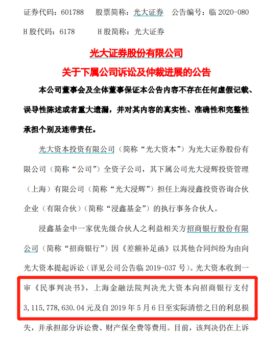 公告显示,光大证券全资子公司光大资本收到一审《民事判决书》,上海金融法院判决光大资本向招商银行支付31.12亿元及自2019年5月6日至实际清偿之日的利息损失,并承担部分诉讼费、财产保全费等费用。