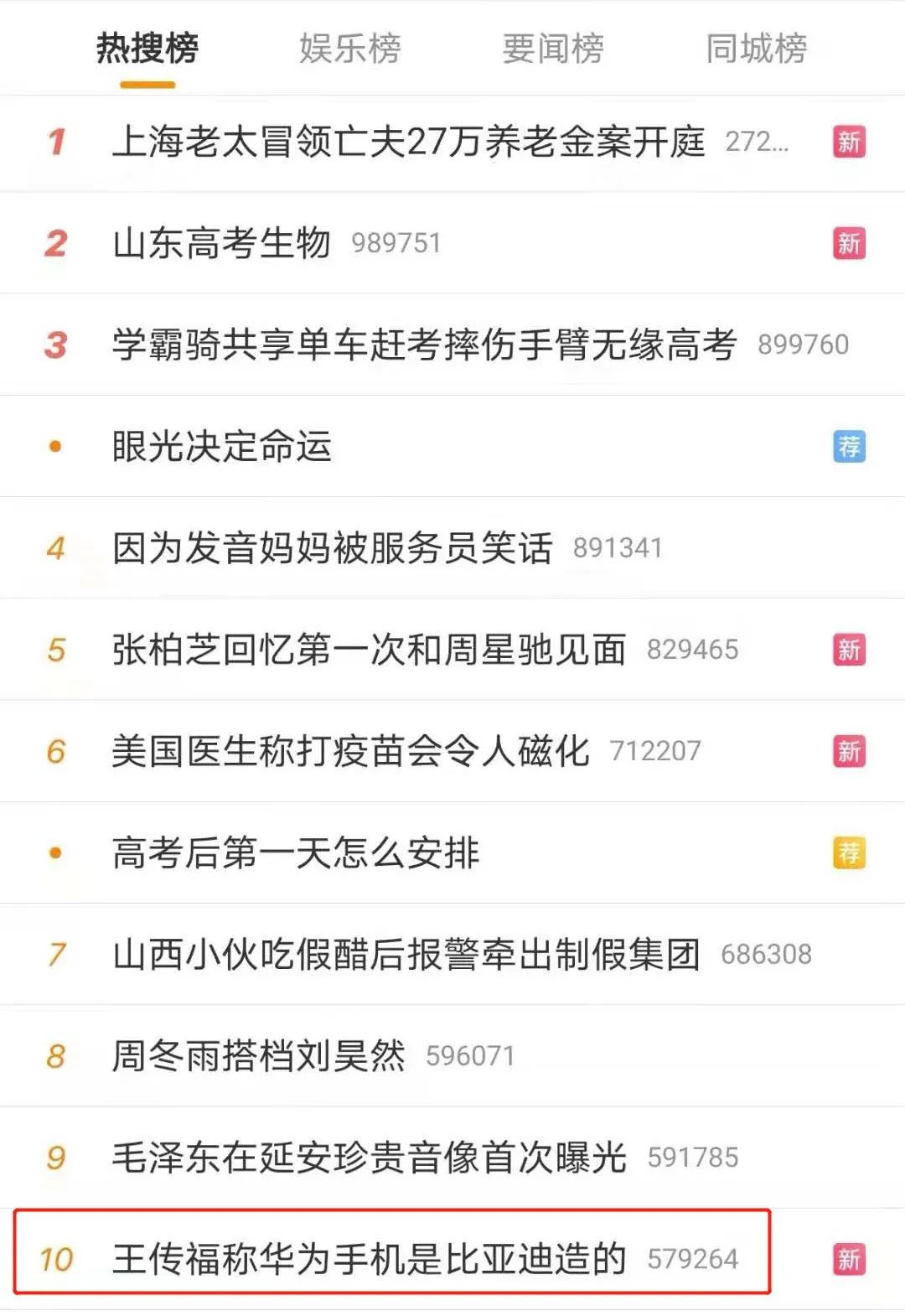 6月10日下午,#王传福称华为手机是比亚迪造的#冲上微博热搜。