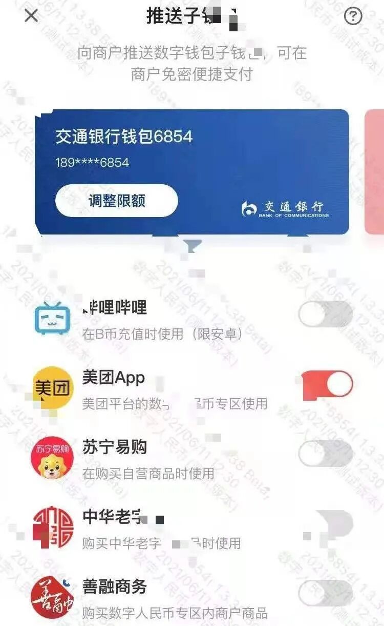 叶先生通过交通银行中签,在他手机上可以看到,其可推送子钱包覆盖商户(即向这些商户推送数字人民币子钱包,就可以在这些商户免密便捷支付)中,有美团APP、滴滴出行、真快乐(国美线上商城)、东方航空、携程、天府通(成都公交地铁乘车APP)、哔哩哔哩、苏宁易购、中华老字号、善融商务(建行主推的线上商城)等APP。
