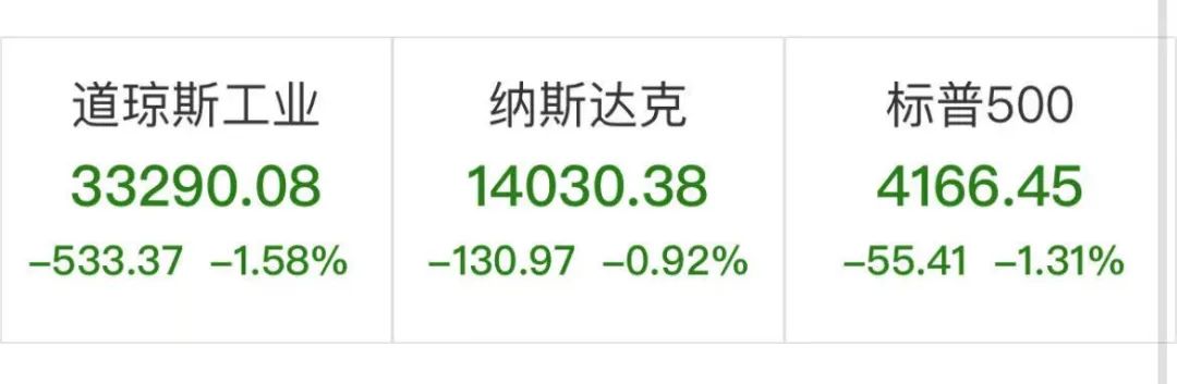截至收盘,道指跌533.37点,或1.58%,报33290.08点;纳指跌130.97点,或0.92%,报14030.38点;标普500指数跌55.41点,或1.31%,报4166.45点。