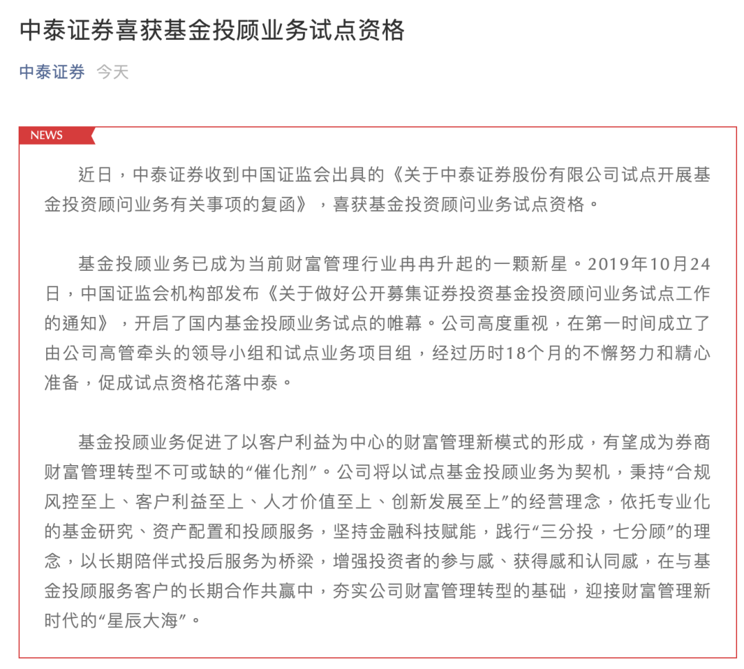 中泰证券也称,2019年10月公司第一时间成立了由高管牵头的领导小组和试点业务项目组,经过历时18个月的不懈努力和精心准备,促成试点资格花落中泰。