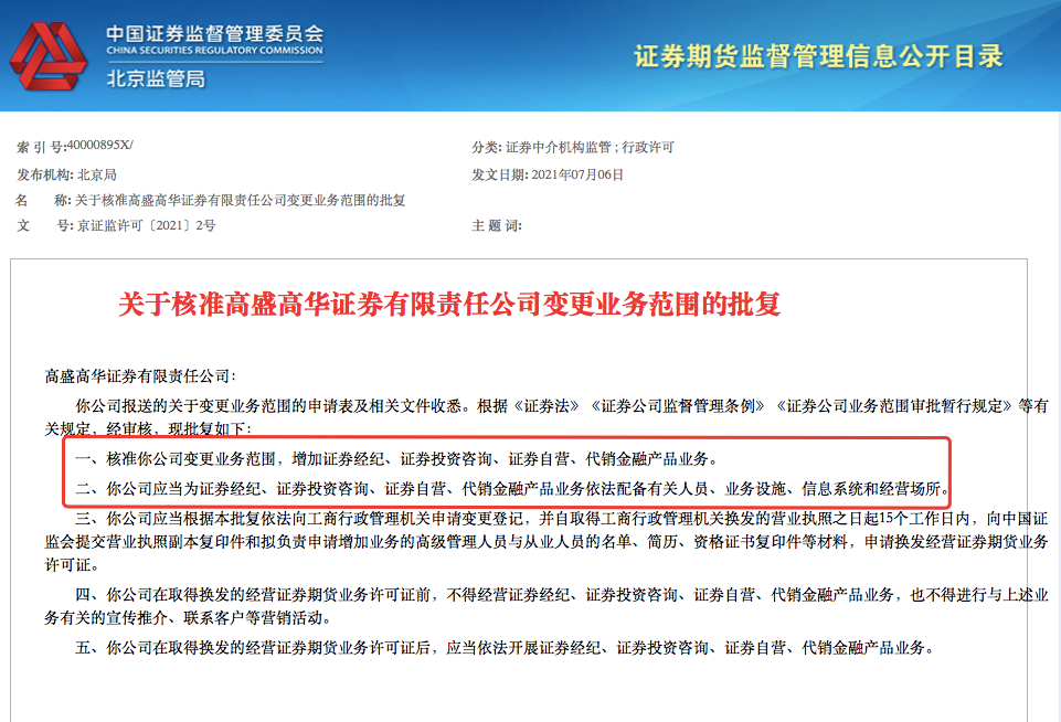 具体而言,北京证监局核准高盛高华变更业务范围,增加证券经纪、证券投资咨询、证券自营、代销金融产品业务。