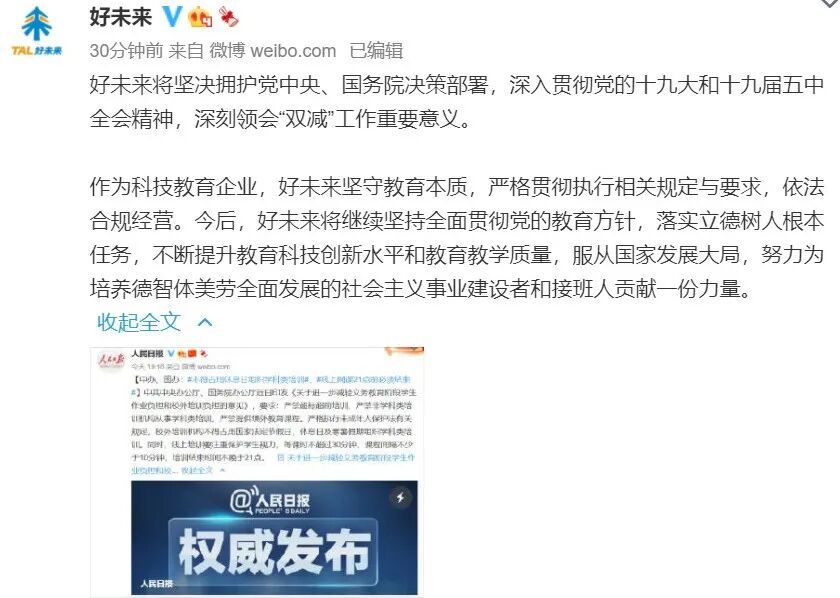好未来也回应称将坚决拥护党中央、国务院决策部署,深入贯彻党的十九大和十九届五中全会精神,深刻领会“双减”工作重要意义。作为科技教育企业,好未来坚守教育本质,严格贯彻执行相关规定与要求,依法合规经营。今后,好未来将继续坚持全面贯彻党的教育方针,落实立德树人根本任务,不断提升教育科技创新水平和教育教学质量,服从国家发展大局,努力为培养德智体美劳全面发展的社会主义事业建设者和接班人贡献一份力量。