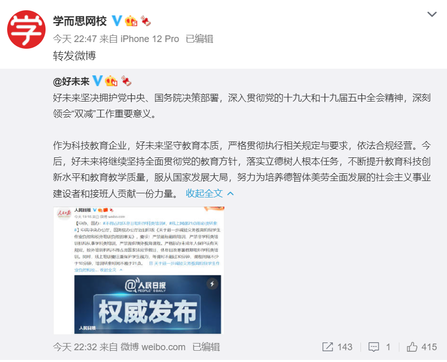 学而思网校官方微博也转发了好未来官微的内容。