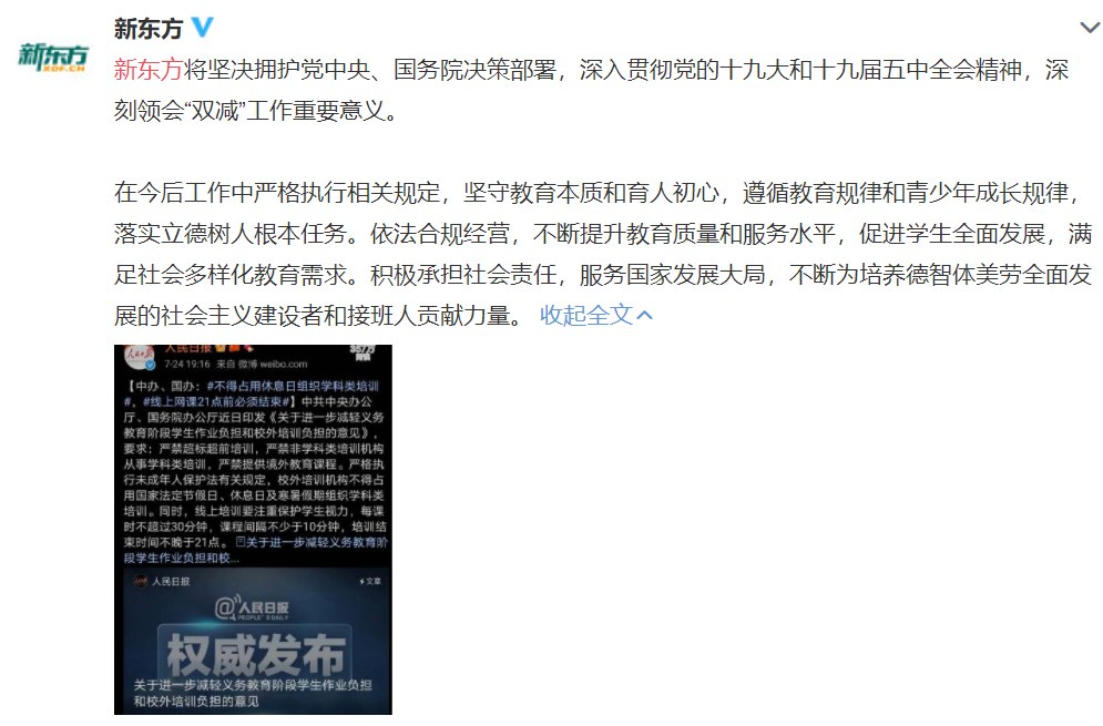 新东方24日晚在其官方微博回应称,新东方将坚决拥护党中央、国务院决策部署,深入贯彻党的十九大和十九届五中全会精神,深刻领会“双减”工作重要意义。在今后工作中严格执行相关规定,坚守教育本质和育人初心,遵循教育规律和青少年成长规律,落实立德树人根本任务。依法合规经营,不断提升教育质量和服务水平,促进学生全面发展,满足社会多样化教育需求。积极承担社会责任,服务国家发展大局,不断为培养德智体美劳全面发展的社会主义建设者和接班人贡献力量。