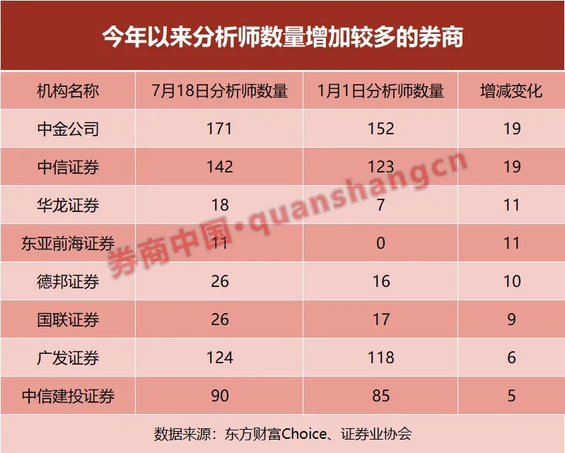 头部券商也在加码招揽分析师。证券业协会7月18日数据显示,中金公司研究所在协会登记备案的分析师多达171人,成为证券业第一大研究所。