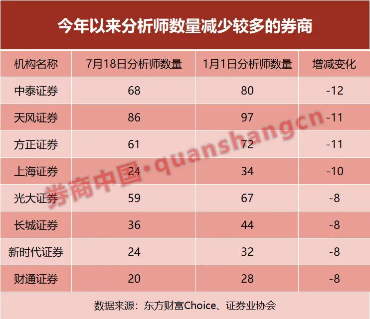 根据券商中国记者的统计,截至7月18日,中泰证券登记备案的分析师数量为68人,从年初的80人减少12人。