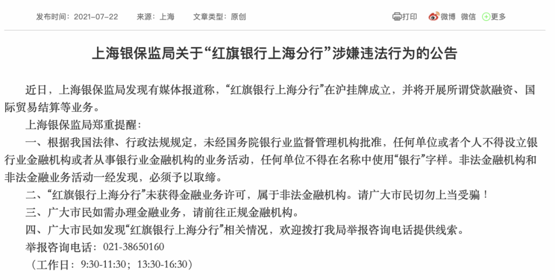 7月22日,上海银保监局发布公告称,“红旗银行上海分行”涉嫌违法。