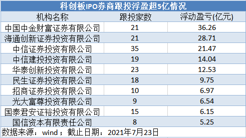 数据统计显示,截至7月23日,各家券商旗下另类投资子公司跟投科创板浮盈共计212亿,其中,中金公司、海通证券和中信证券跟投浮盈收入位居前三,券商跟投无疑也成为贡献可观收入的重要业务条线之一。