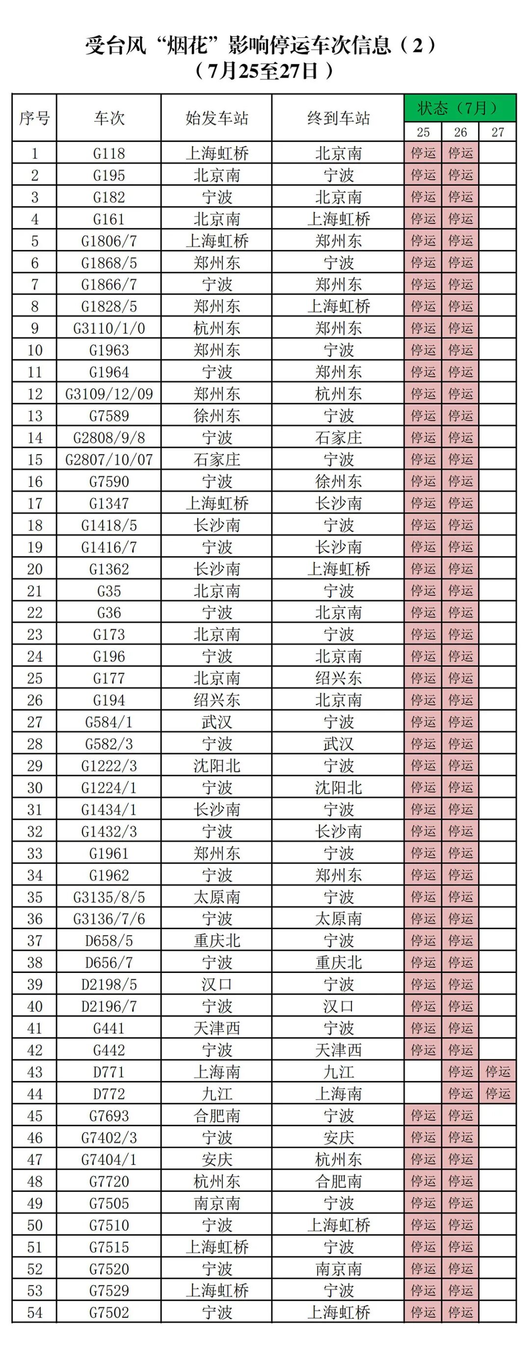 7月25日、26日,杭甬高铁停运;