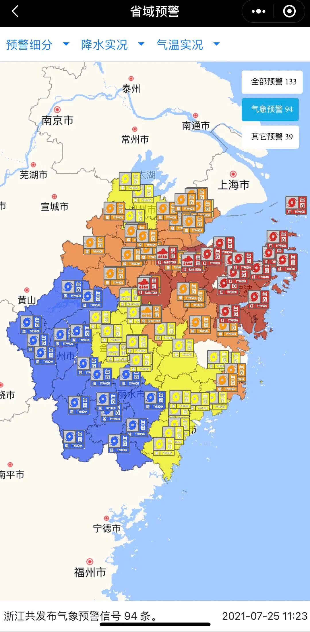 截至25日11时23分,浙江正在预警133条,其中气象预警94条,13地启动最高级别台风红色预警。