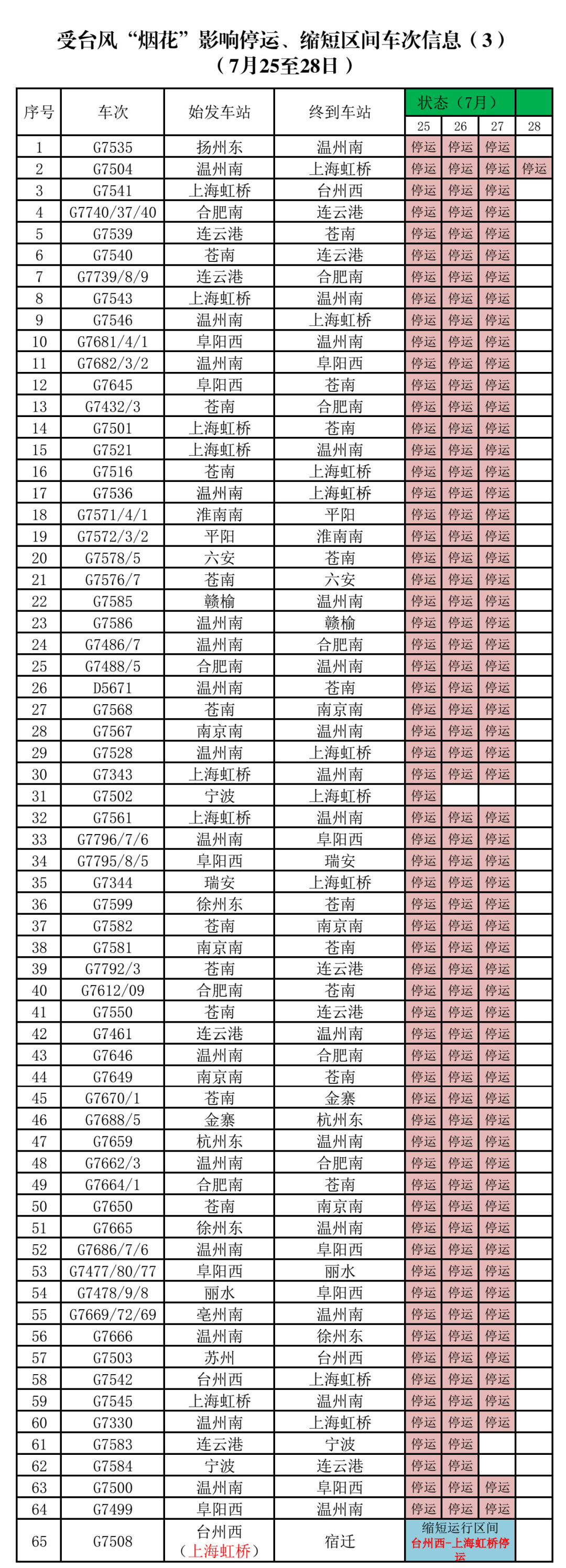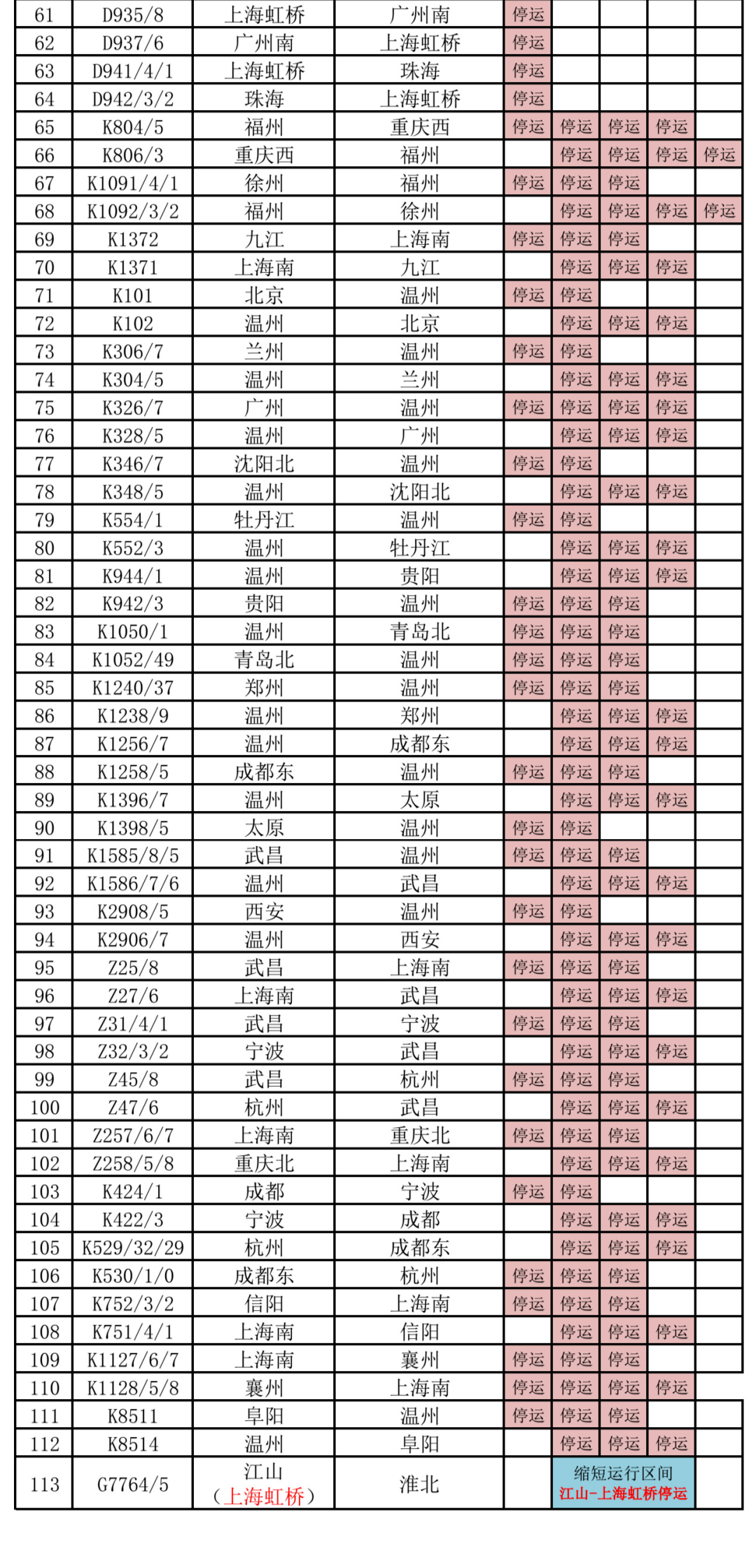 部分停运、缩短区间列车车次详情