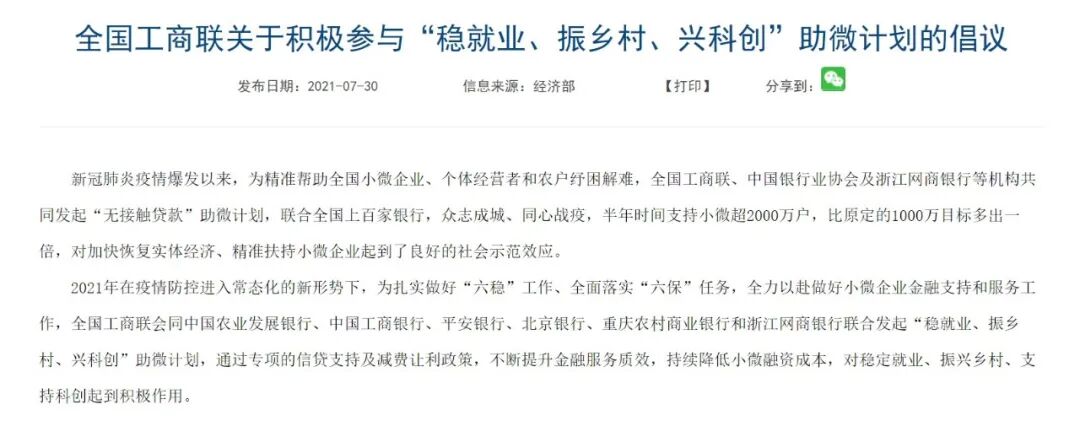 7月30日,全国工商联宣布,与农业发展银行、工商银行、平安银行、北京银行、重庆农商行、网商银行一起,共同发起新一年度的“助微计划”,发挥金融力量,“稳就业、振乡村、兴科创”。