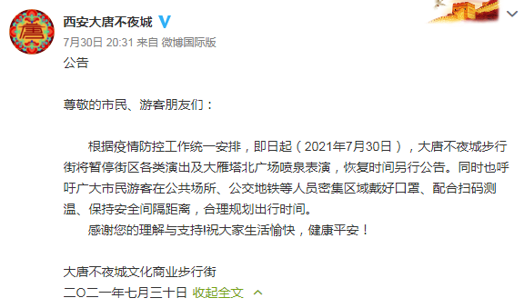 30日晚上,西安大唐不夜城文化商业步行街发布公告,街区各类演出及大雁塔北广场喷泉表演即日起暂停,恢复时间另行公告。
