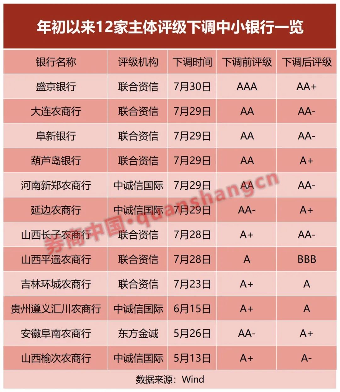 Wind数据显示,截至7月30日,年内已有12家国内中小银行主体信用等级被直接下调,包括9家农商行、3家城商行。