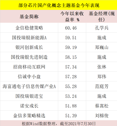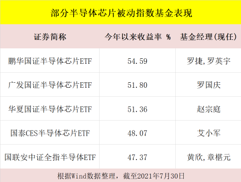 Wind数据显示,华夏国证半导体芯片ETF、国泰CES半导体芯片ETF等多只被动指数基金今年以来收益率达50%左右,同时,金信稳健策略、信诚中小盘、诺安成长等多只投资半导体板块的基金今年收益也达到50%、60%。