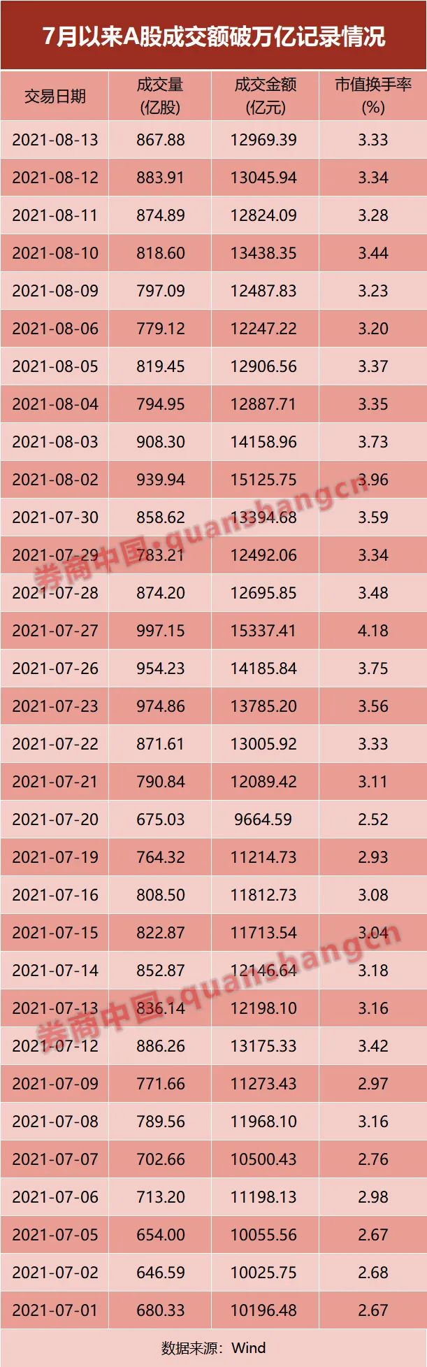 券商中国记者注意到,A股成交额迎来历史性时刻,wind数据显示,7月21日以来,A股每个交易日的交易额都超过万亿元,日成交额在1.2万亿元~1.5亿元,这意味着,7月21日至8月13日,A股已经连续18个交易日成交额超过万亿元,已经创造了A股成交历史第二纪录。