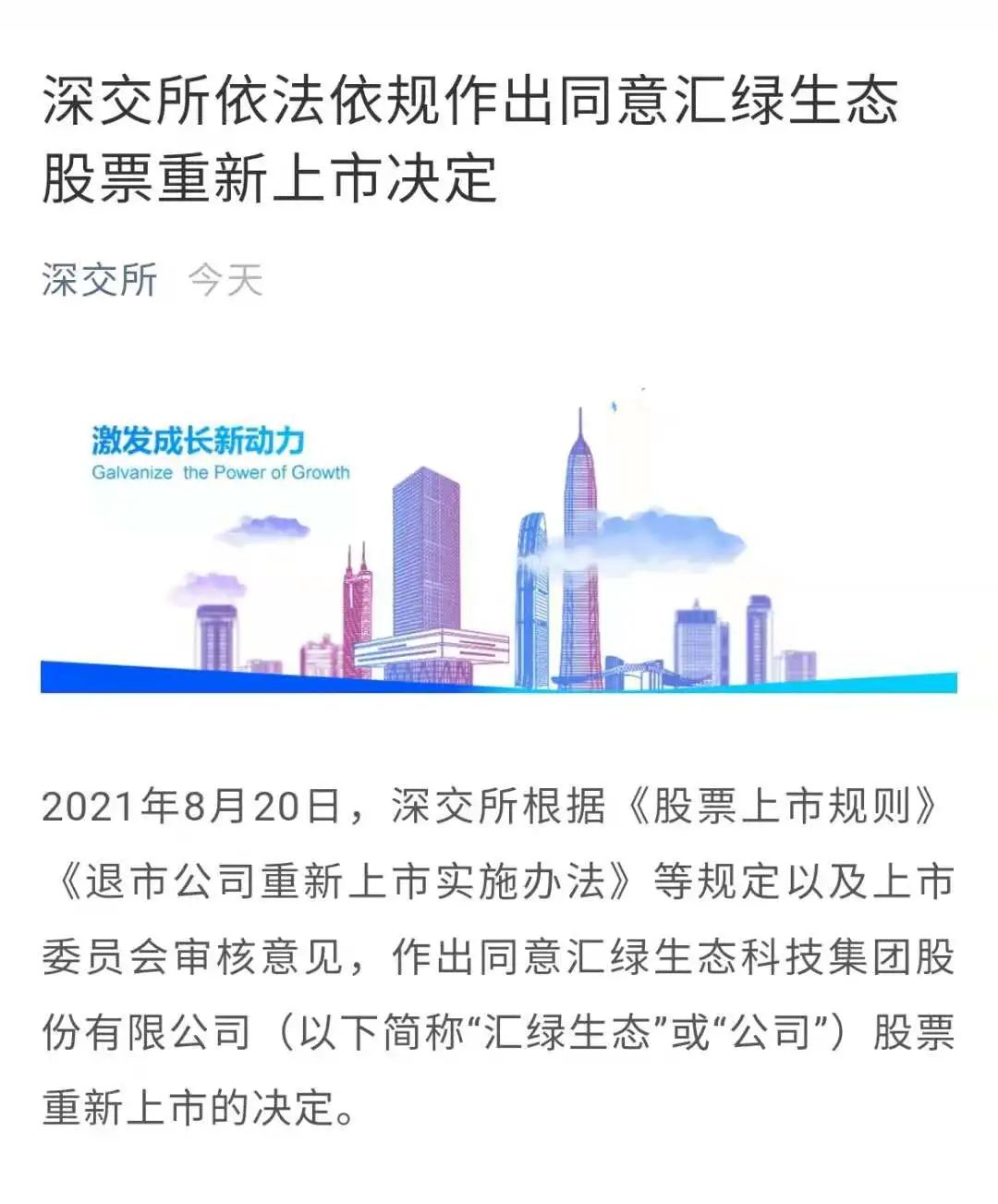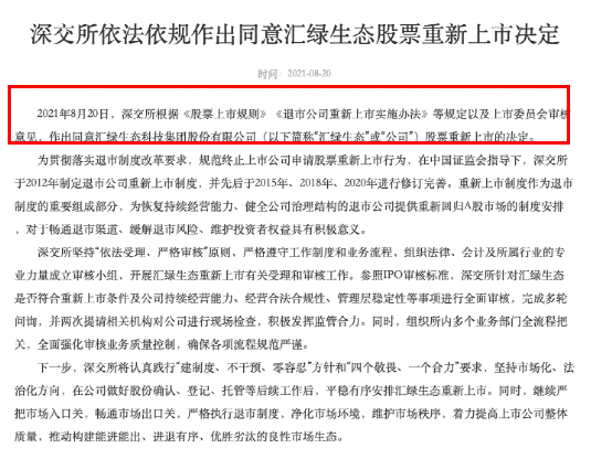 8月20日,深交所官网显示,深交所依法依规作出同意汇绿生态股票重新上市决定。