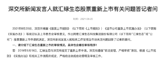 深交所新闻发言人就汇绿生态股票重新上市有关问题答记者问