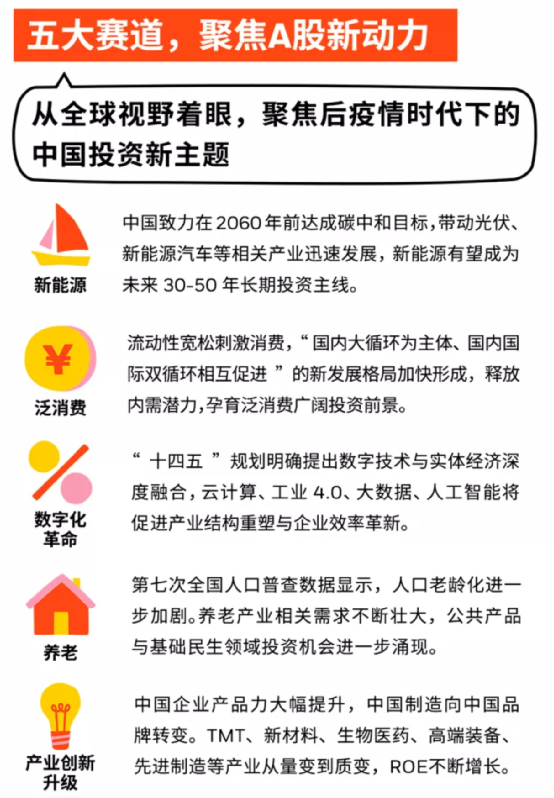 贝莱德中国新视野拟任基金经理唐华也称,经历了疫情全球大流行,中国不仅在经济复苏上领先全球,中国的企业在成本优势的基础上,越来越多地在技术创新、管理和创意输出、品牌力提升等方面推行积极的变化。“贝莱德中国新视野混合型证券投资基金将从全球大视野着眼,关注时代变局,聚焦来自新能源、泛消费、数字化革命、养老、产业创新升级的五大增长新动力。我们对中国市场长期发展趋势充满信心。”