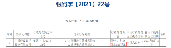 建设银行则因占压财政存款或者资金,违反账户管理规定,被警告并处罚款388万元。