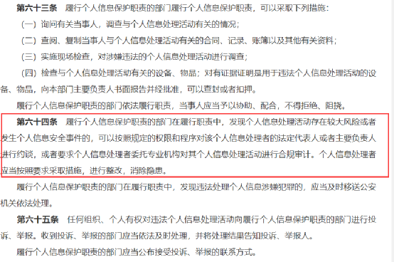 法律明确,履行个人信息保护职责的部门发现个人信息处理活动存在较大风险或者发生个人信息安全事件的,可以按照规定的权限和程序对该个人信息处理者的法定代表人或者主要负责人进行约谈,或者要求个人信息处理者委托专业机构对其个人信息处理活动进行合规审计。