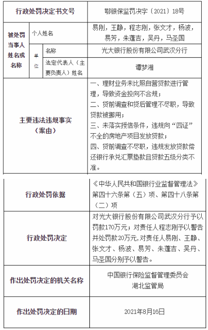 中国银保监会湖北监管局官网于20日更新一则处罚。罚单显示,光大银行武汉分行因违规向房企发放贷款等4项原因被罚170万元,具体违法违规案由如下: