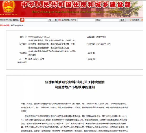 7月13日,住建部、发改委、公安部等八部门联合印发了《关于持续整治规范房地产市场秩序的通知》,提出要以问题为导向,重点整治房地产开发、房屋买卖、住房租赁、物业服务等领域人民群众反映强烈、社会关注度高的突出问题。