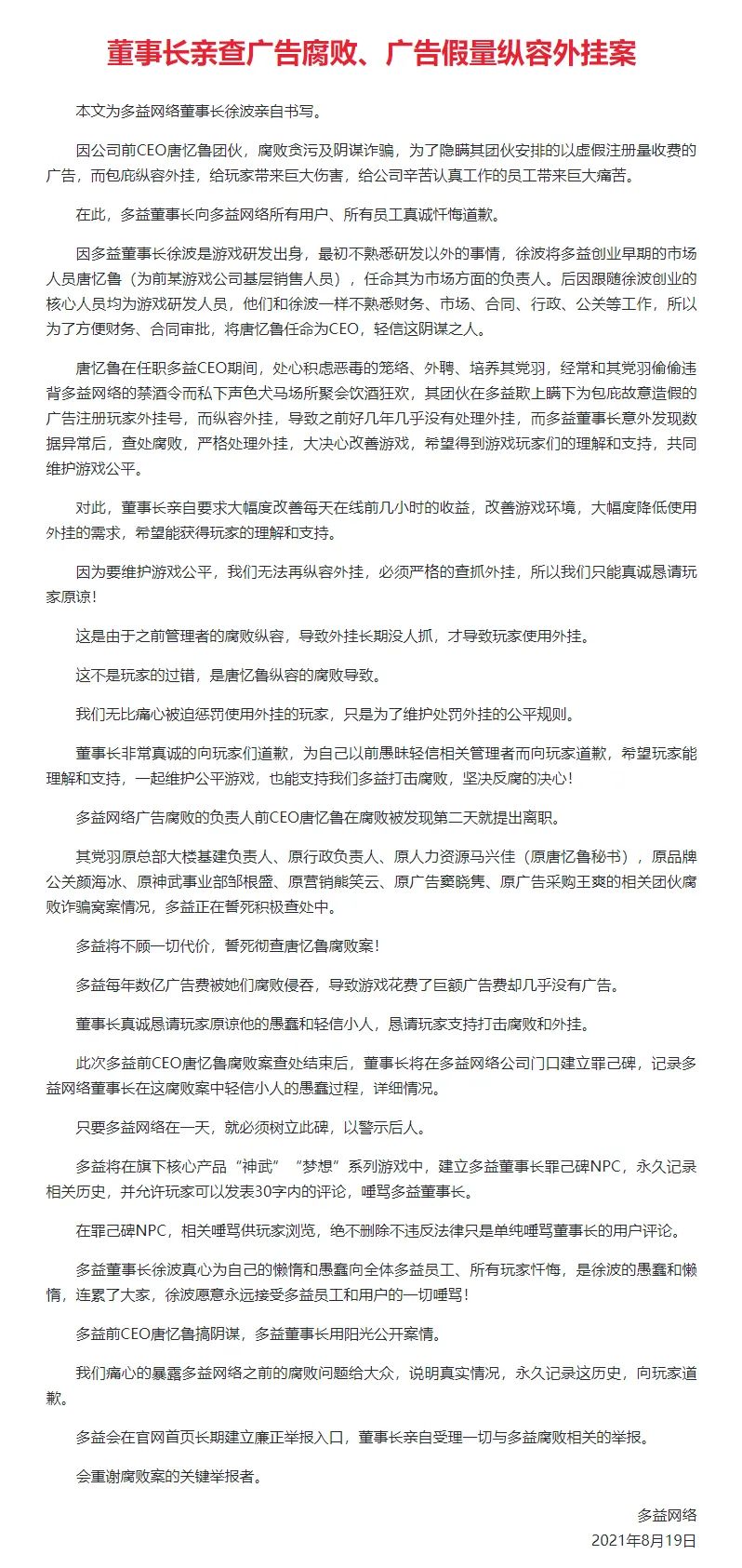 8月19日下午,多益网络董事长徐波在其官网首页发布了一篇亲笔长文《董事长亲查广告腐败、广告假量纵容外挂案》,对公司前CEO唐忆鲁所犯下的“腐败贪污数亿元”行为进行了痛诉。