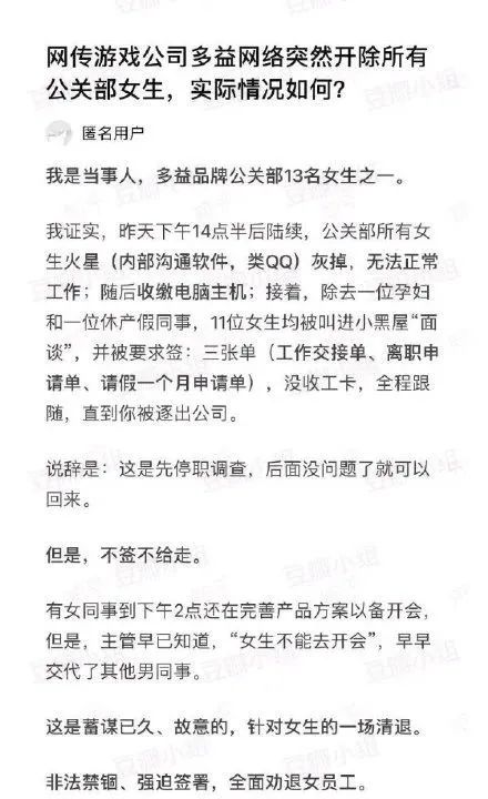 该名员工称,多益网络这是蓄谋已久、针对女生的一场清退、