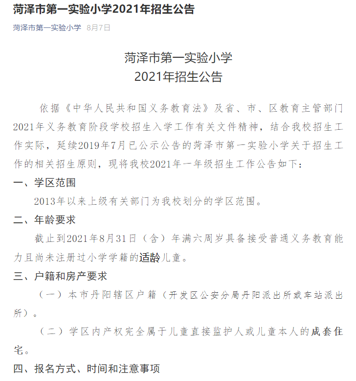对此事,e公司记者查询了菏泽市第一小学相关招生公告,并未发现上述规定。
