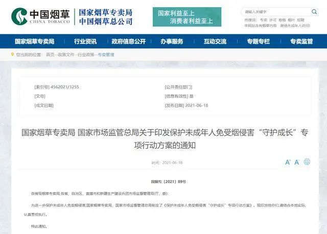 2021年6月18日,国家烟草专卖局、国家市场监督管理总局发布通知,共同印发《保护未成年人免受烟侵害“守护成长”专项行动方案》。