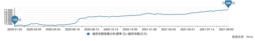 从融资规模变化来看,Wind数据显示,自2020年初以来,A股融资余额逐渐从2020年初的1.01万亿元增长至9月9日的1.74亿元。
