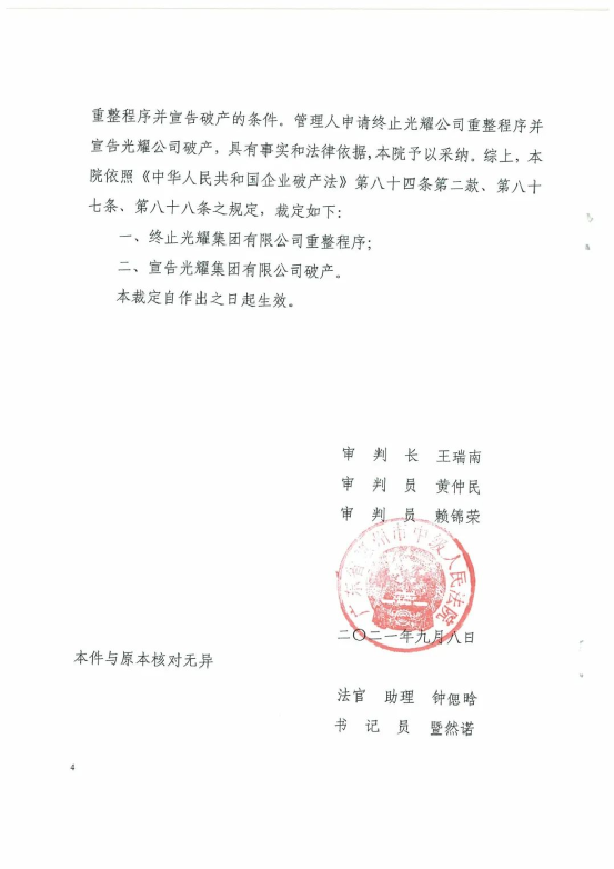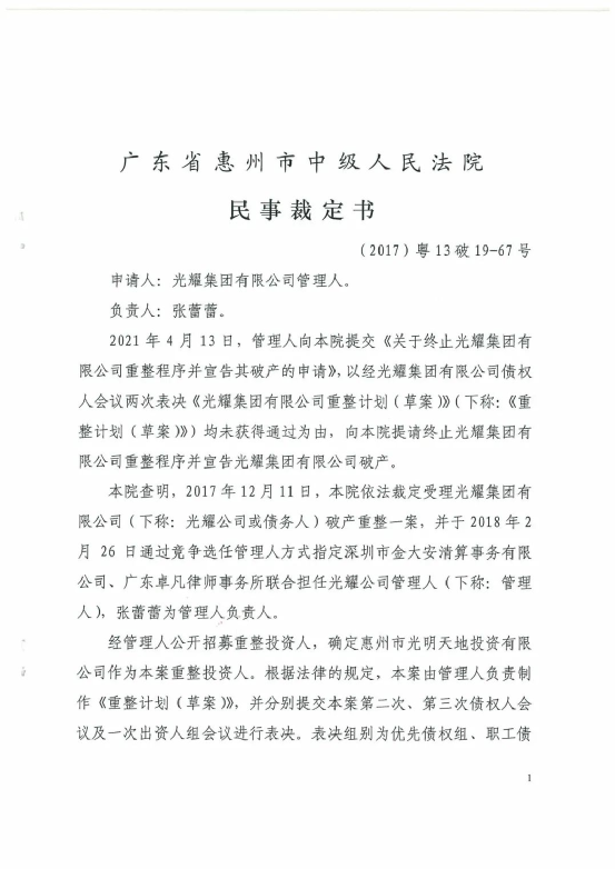 9月8日,惠州中院出具(2017)粤13破19-67号《民事裁定书》,裁定终止光耀集团重整程序并宣告光耀集团破产。