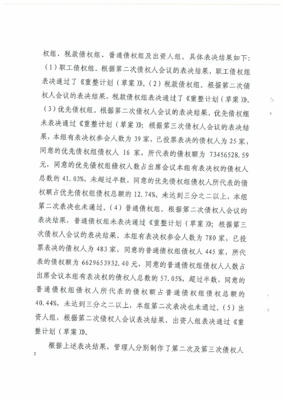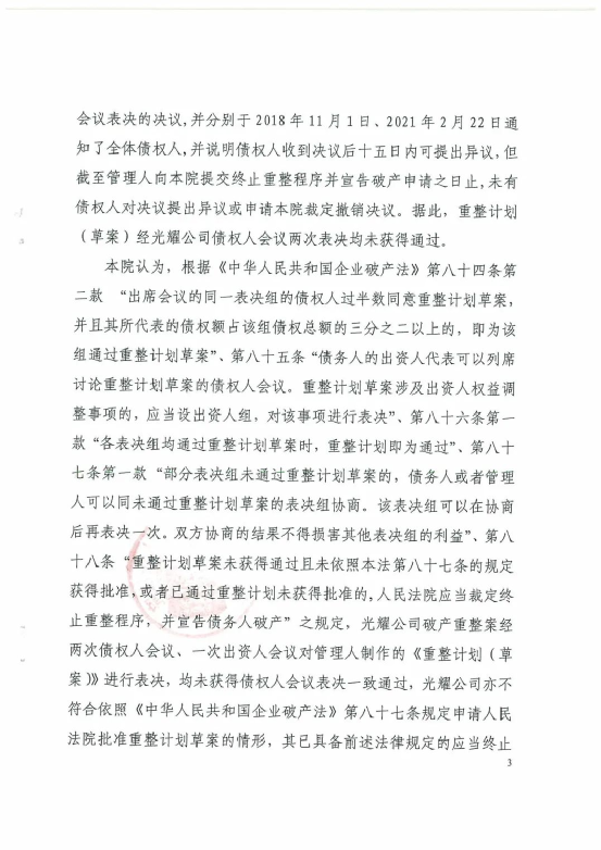 根据“光耀集团管理人”微信公众号今天中午发布的公告,因《光耀集团有限公司重整计划(草案)》未获得通过,光耀集团符合《中华人民共和国企业破产法》第二条、第八十八条规定的应终止重整程序并宣告破产的情形,相关管理人已于2021年3月15日依法向惠州中院提请裁定终止光耀集团重整程序,并宣告光耀集团破产。