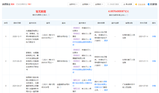 2013年5月,光耀集团、光耀地产曾向深圳某商业银行申请贷款,但因为有不履行法院判决的失信记录而被拒绝。