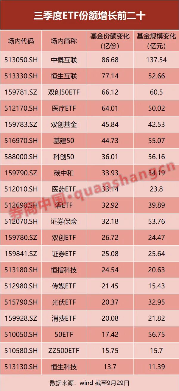 Wind数据显示,截至9月29日,中概互联(513050)、恒生互联(513330)自三季度以来份额分别增长了88.68亿份、77.14亿份,居三季度ETF份额增长前二,如果按区间成交均价粗略计算,两只ETF分别在三季度吸金137.54亿元、52.66亿元。