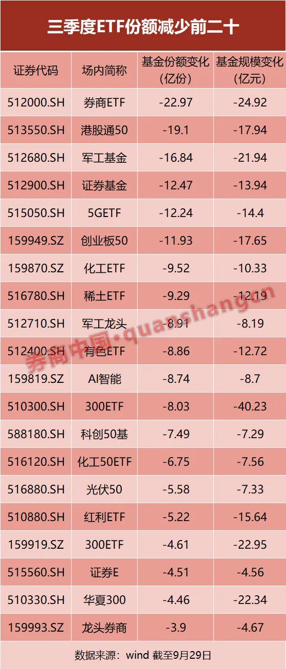 此外,券商、周期、军工等板块在三季度“先扬后抑”,部分资金已经选择止盈,多只相关ETF均在三季度遭遇了不同程度的减持。