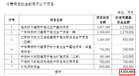 宁德时代此次发行拟募集582亿元,其中419亿元用于福鼎时代锂离子电池生产基地项目(以下简称福鼎项目)等5个电池生产项目。2021年半年度报告显示,公司动力电池及储能系统现有产能65.45GWh,在建产能 92.50 GWh,此次发行募投项目将新增锂离子电池年产能约137 GWh、储能电柜年产能约 30GWh。锂电池产能等于新增近一倍。