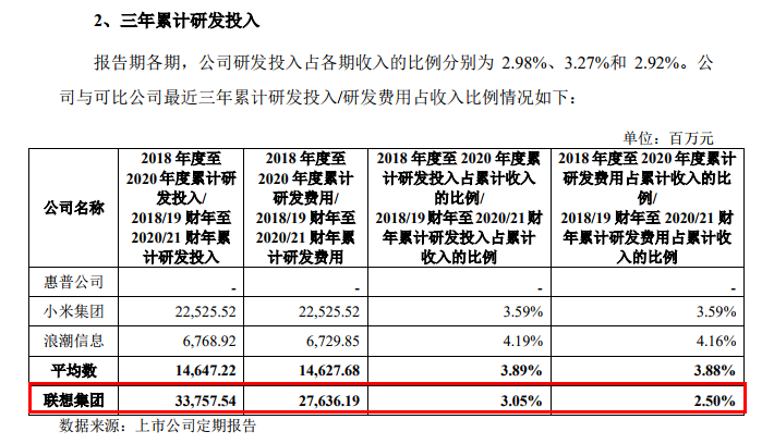 研发投入占比较低,也是市场质疑的关键点之一。虽然联想集团近三个财年的研发投入均超过了100亿元,但3年累计研发投入占累计收入的比例仅为3.05%,低于小米集团的3.59%,浪潮信息的4.19%,跟华为相比更是相差甚远(华为每年会把10%以上的销售收入用于研发,去年这一比例高达15.9%)。