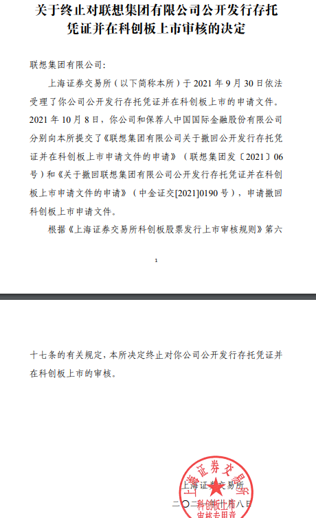 同时,上交所发布公告称,10月8日,联想集团和保荐人中金公司分别向上交所提交了《联想集团有限公司关于撤回公开发行存托凭证并在科创板上市申请文件的申请》和《关于撤回联想集团有限公司公开发行存托凭证并在科创板上市申请文件的申请》,申请撤回科创板上市申请文件。上交所决定终止对公司公开发行存托凭证并在科创板上市的审核。