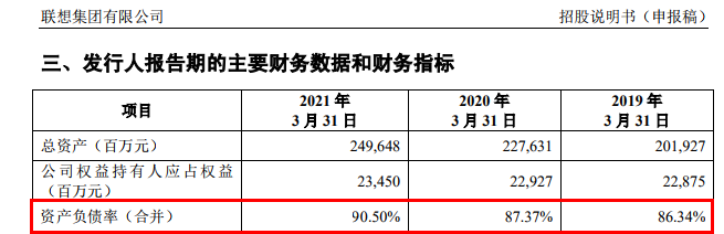 此外,联想集团的资产负债率比较高,也备受市场关注。根据招股书,截至2019年3月31日、2020年3月31日和2021年3月31日,公司资产负债率(合并)分别为86.34%、87.37%和90.50%,资产负债率有上升的趋势。