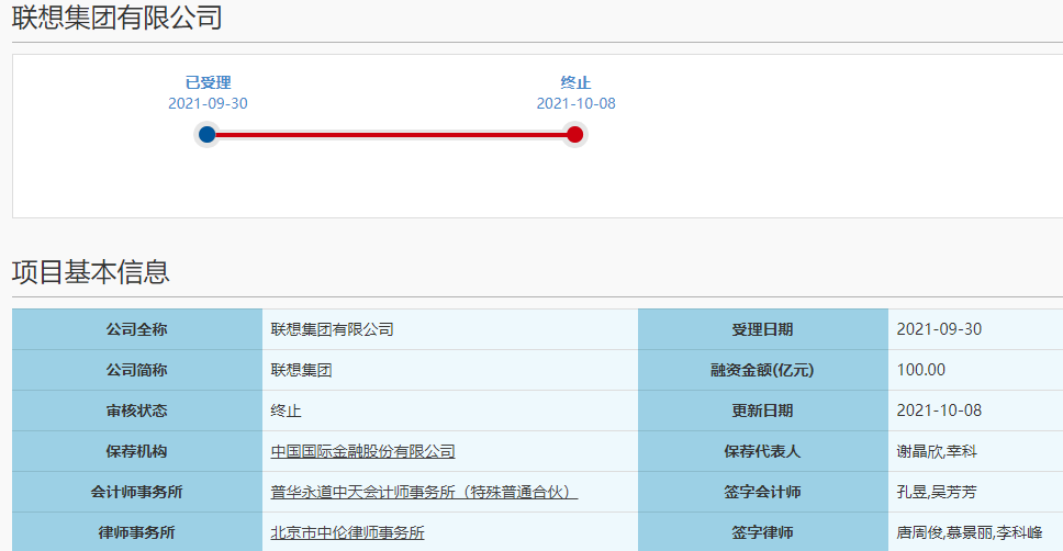 10月8日晚间,上交所官网显示,联想集团的科创板IPO审核状态由“已受理”变为了“终止”。